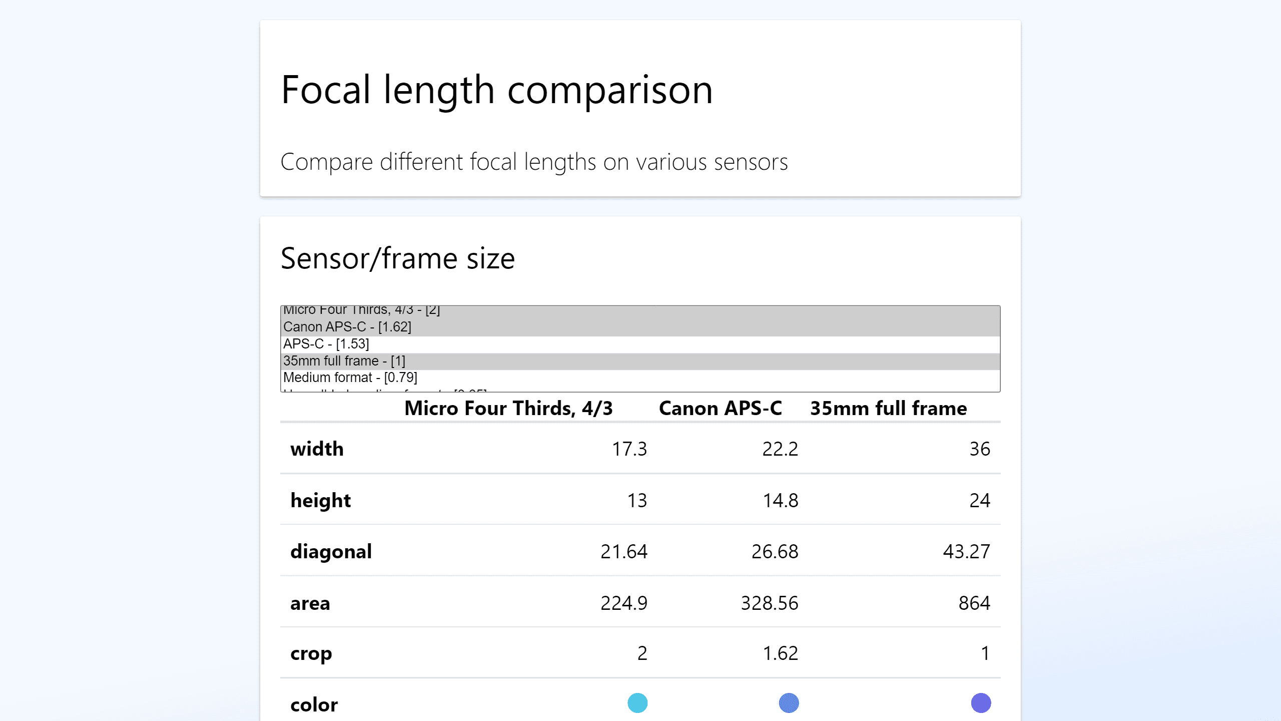 Da ich ein begeisterter Hobby-Photograph bin und manchmal selbst bei den vielen verschiedenen Sensorformaten der Kameras durcheinanderkomme, dachte ich mir da muss ich etwas tun. In der Anwendung kann man verschiedene Sensoren auswählen, deren Daten miteinander vergleichen und sich visuell darstellen lassen. Die Anwendung wurde mit auf Basis von react, emotion (styled-components) und mobx entwickelt