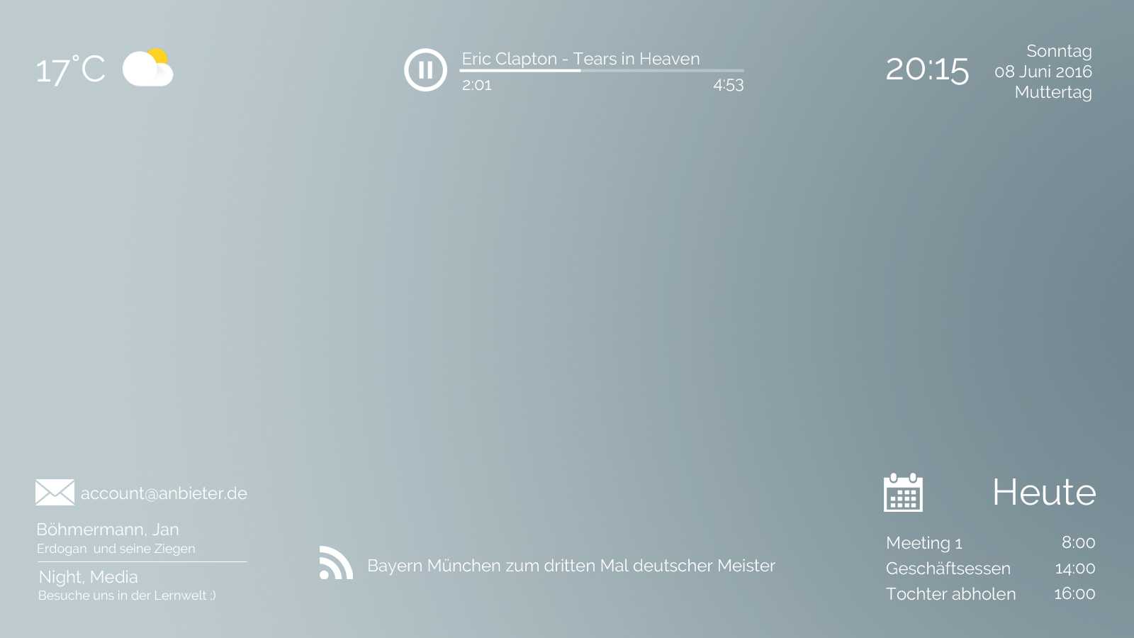 Die Anwendung für den Spiegel entwickelten wir komplett selbst. Als Laufzeitumgebung nutzten wir dazu node.js und implementierten die Anwendung als Web Application, die später in einem Browser im Fullscreen Mode laufen sollte. Unsere Anwendung war dabei so konzipiert, dass später über einen kleinen Store selbst Widgets für den Spiegel programmieren und einspielen könnte. Die Widgets ließen sich dabei über ein Backend konfigurieren und frei auf dem Spiegel positionieren