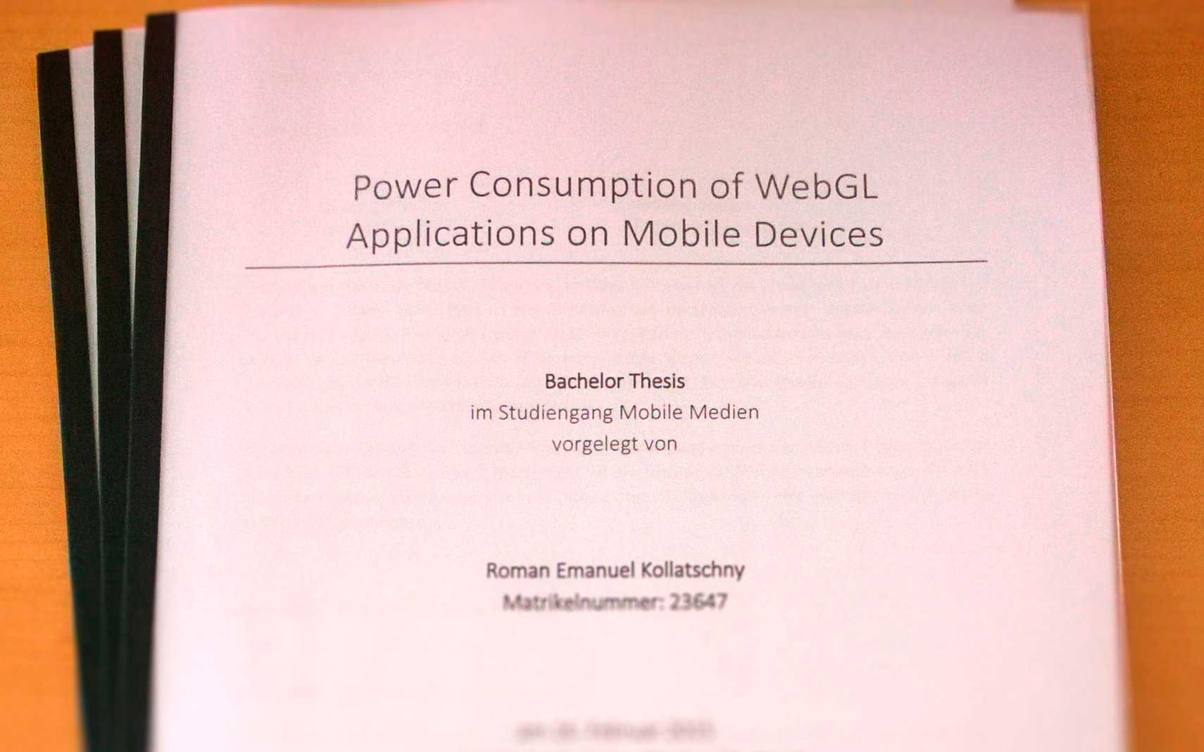 In meiner Bachelor Thesis beschäftigte ich mit dem Stromverbrauch von WebGL Anwendungen auf mobile Endgeräten. Um herauszufinden welche 3D Anwendungen mehr Energie benötigen und ob es Unterschiede bei der Darstellung von gleichen Szenen in unterschiedlichen Browsern entwickelte ich einen Benchmark. In diesem werden verschiedene dreidimensionale Szenen berechnen und dabei der Energieverbrauch in Form des Batterieverbrauchs aufzeichnet.