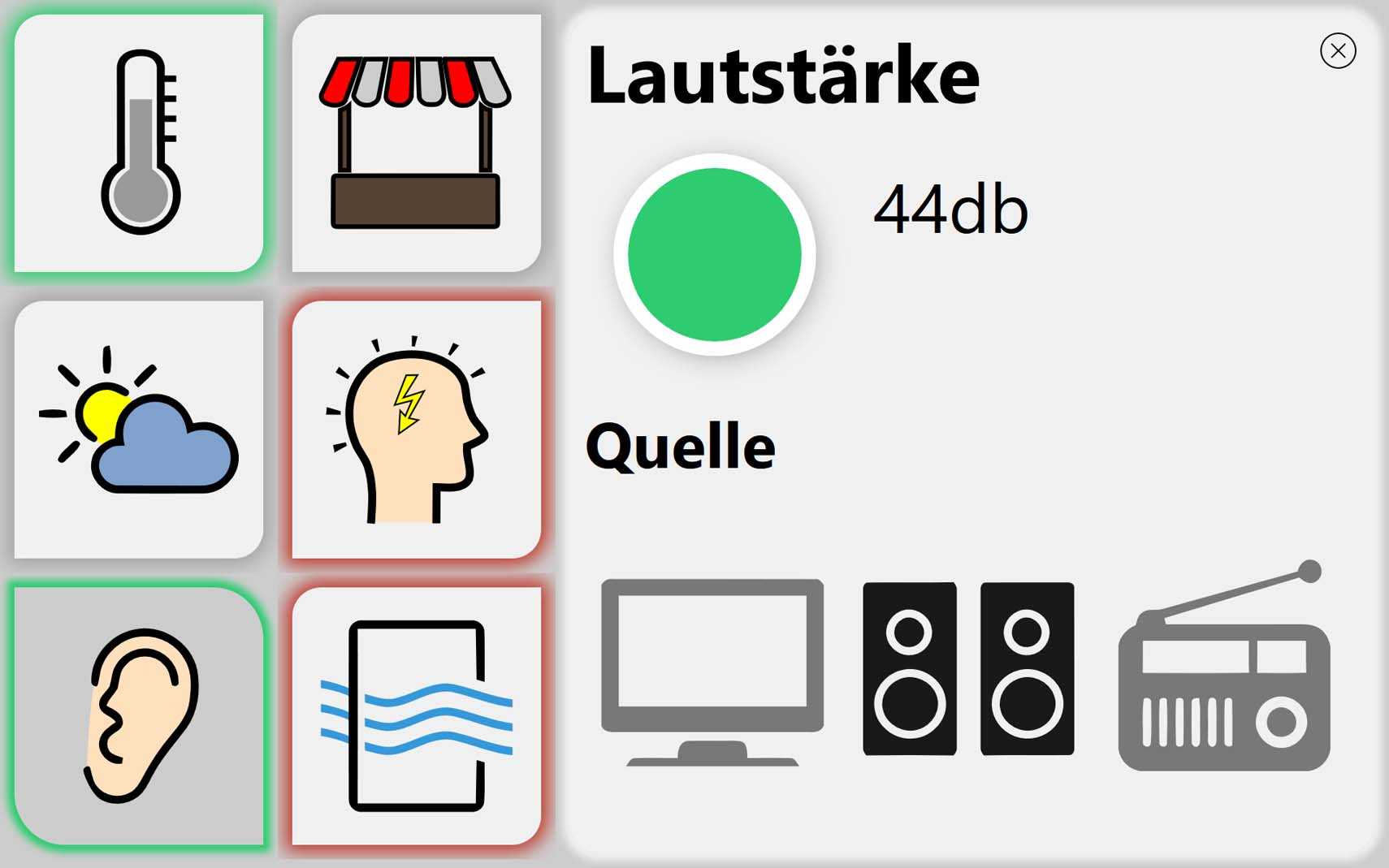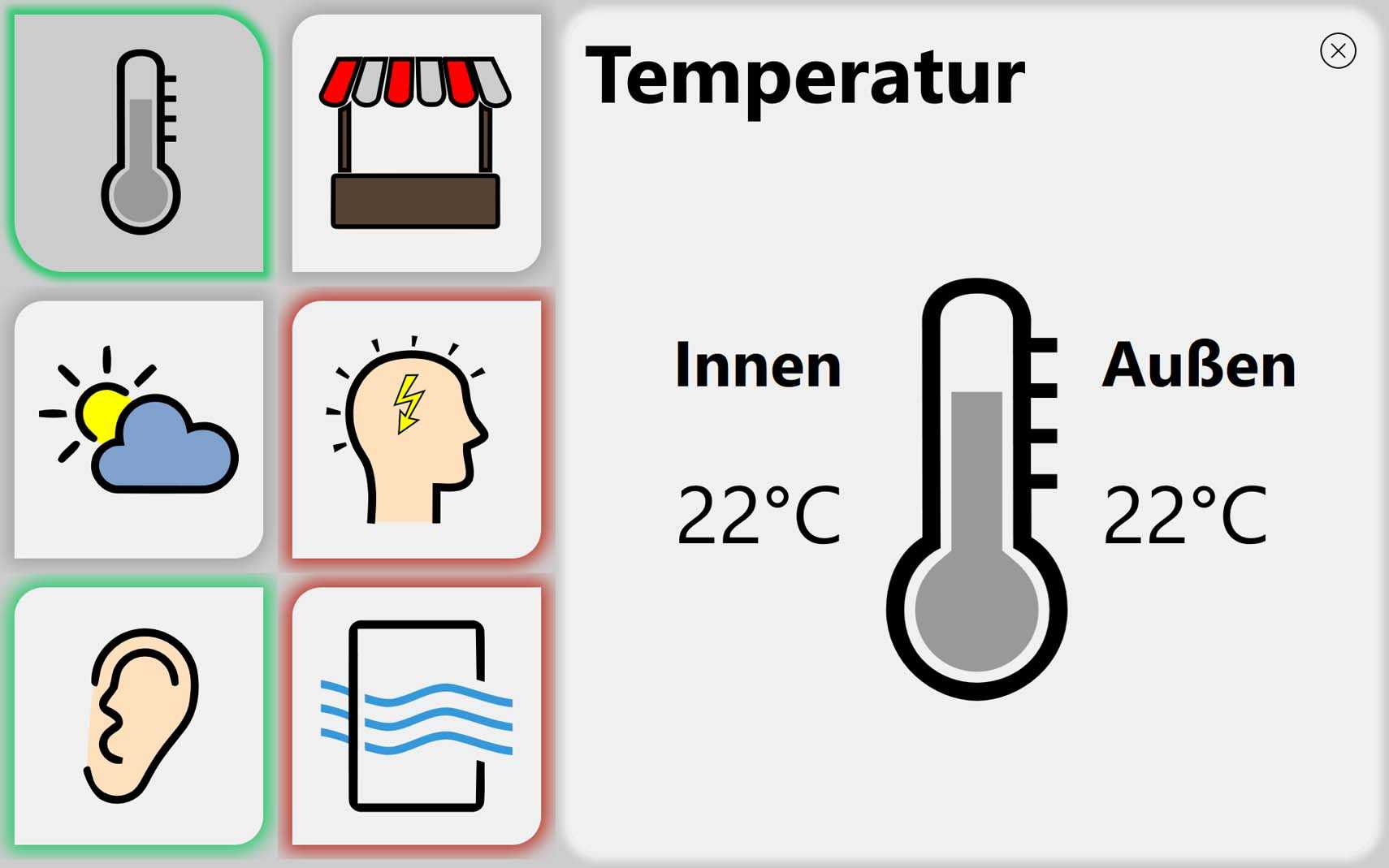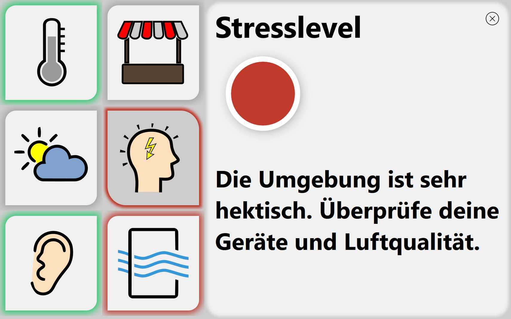 Das Interface wurde dabei speziell auf die Bedürfnisse der Persona angepasst, um ihr ein eigenständiges Leben in ihrer Wohnung zu ermöglichen. Dazu werden verschiedene Informationen wie die Temperatur, die Lärmbelastung, die Luftqualität und ein Stresslevel in Ihrer Wohnung mit Hilfe einer Wetterstation von NetAtmo dargestellt. Zusätzlich werden über weitere APIs Informationen zu regional Verfügbaren Produkten und eine Wettervorhersage bereitgesellt.