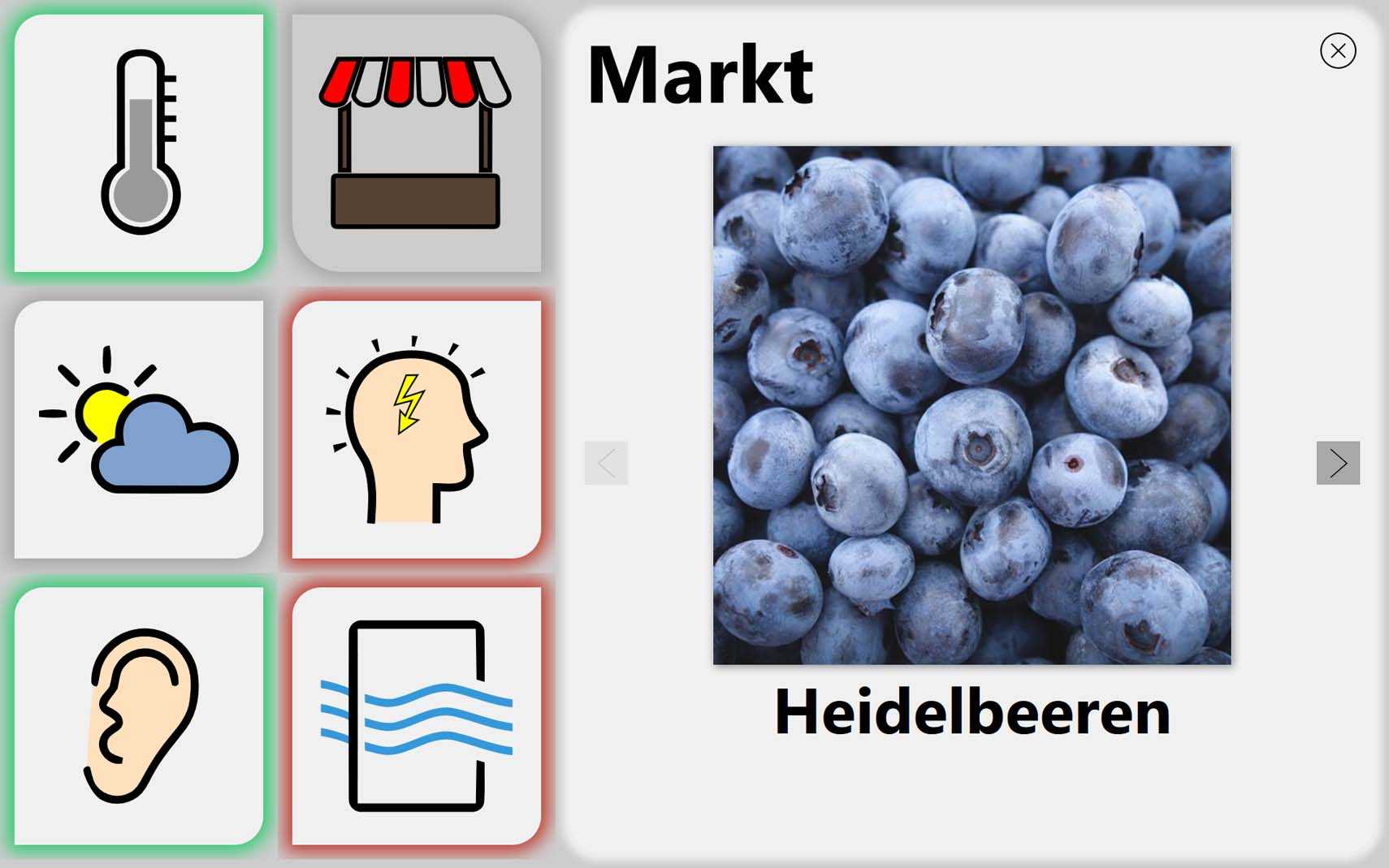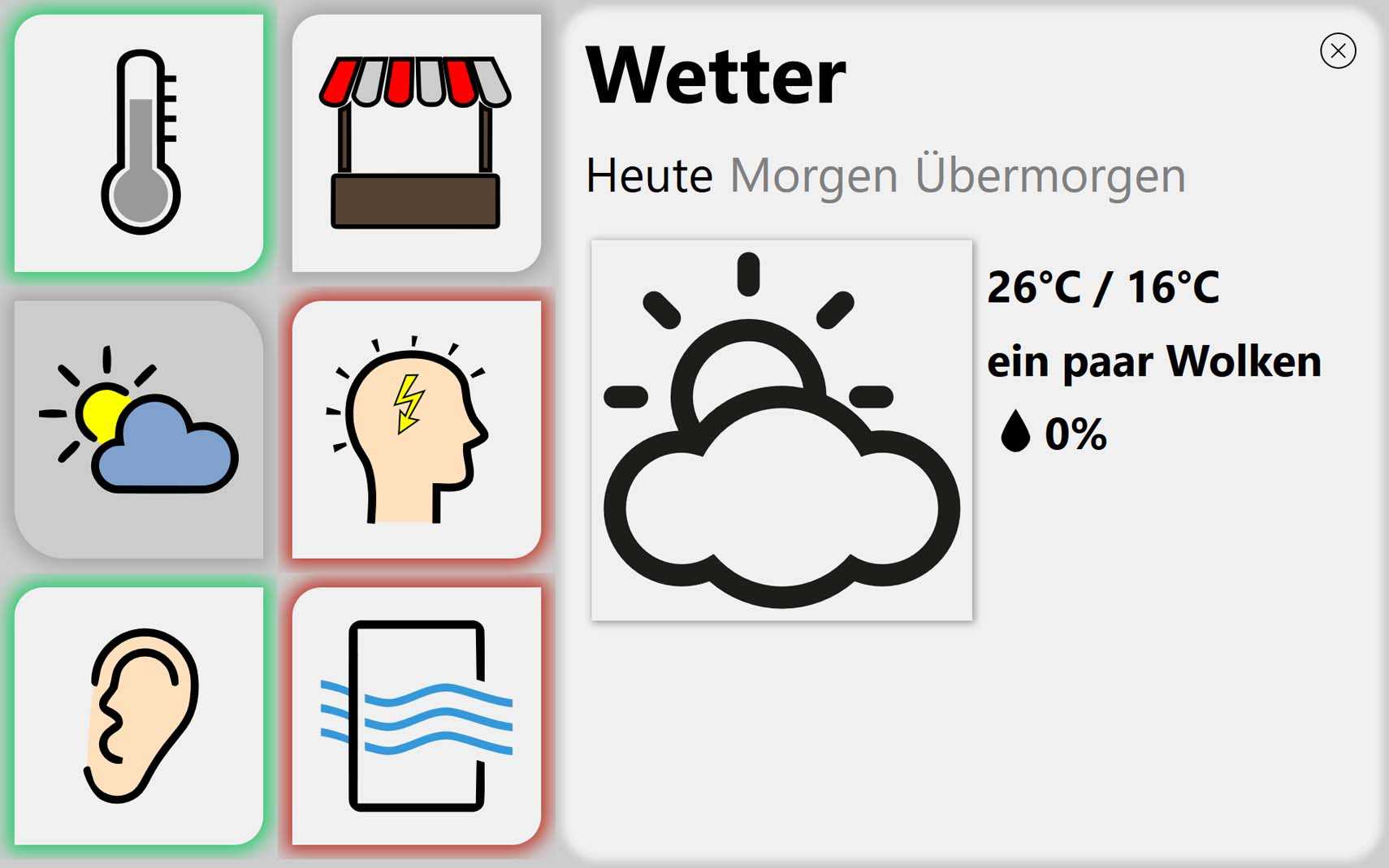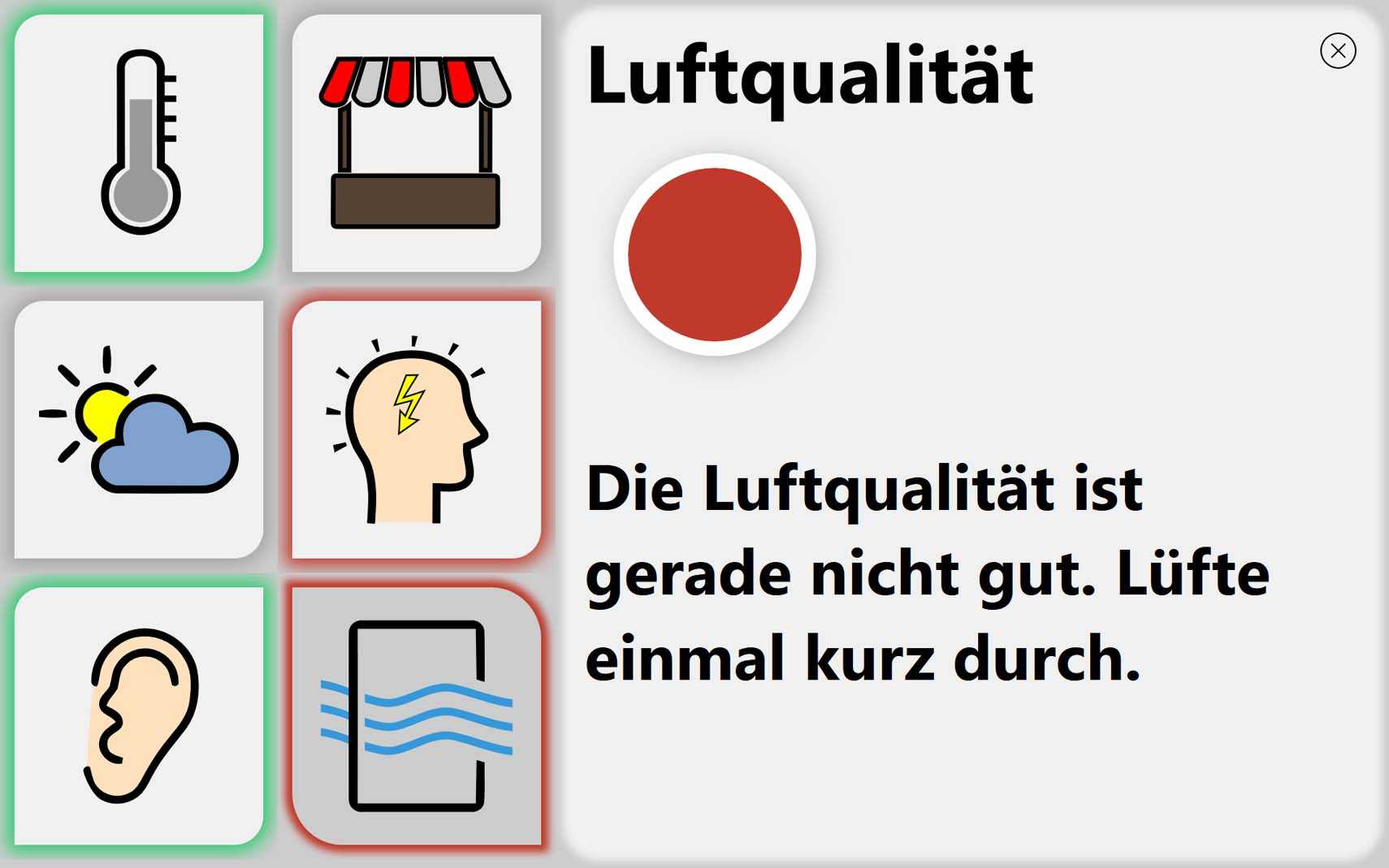 Das Interface wurde dabei speziell auf die Bedürfnisse der Persona angepasst, um ihr ein eigenständiges Leben in ihrer Wohnung zu ermöglichen. Dazu werden verschiedene Informationen wie die Temperatur, die Lärmbelastung, die Luftqualität und ein Stresslevel in Ihrer Wohnung mit Hilfe einer Wetterstation von NetAtmo dargestellt. Zusätzlich werden über weitere APIs Informationen zu regional Verfügbaren Produkten und eine Wettervorhersage bereitgesellt.