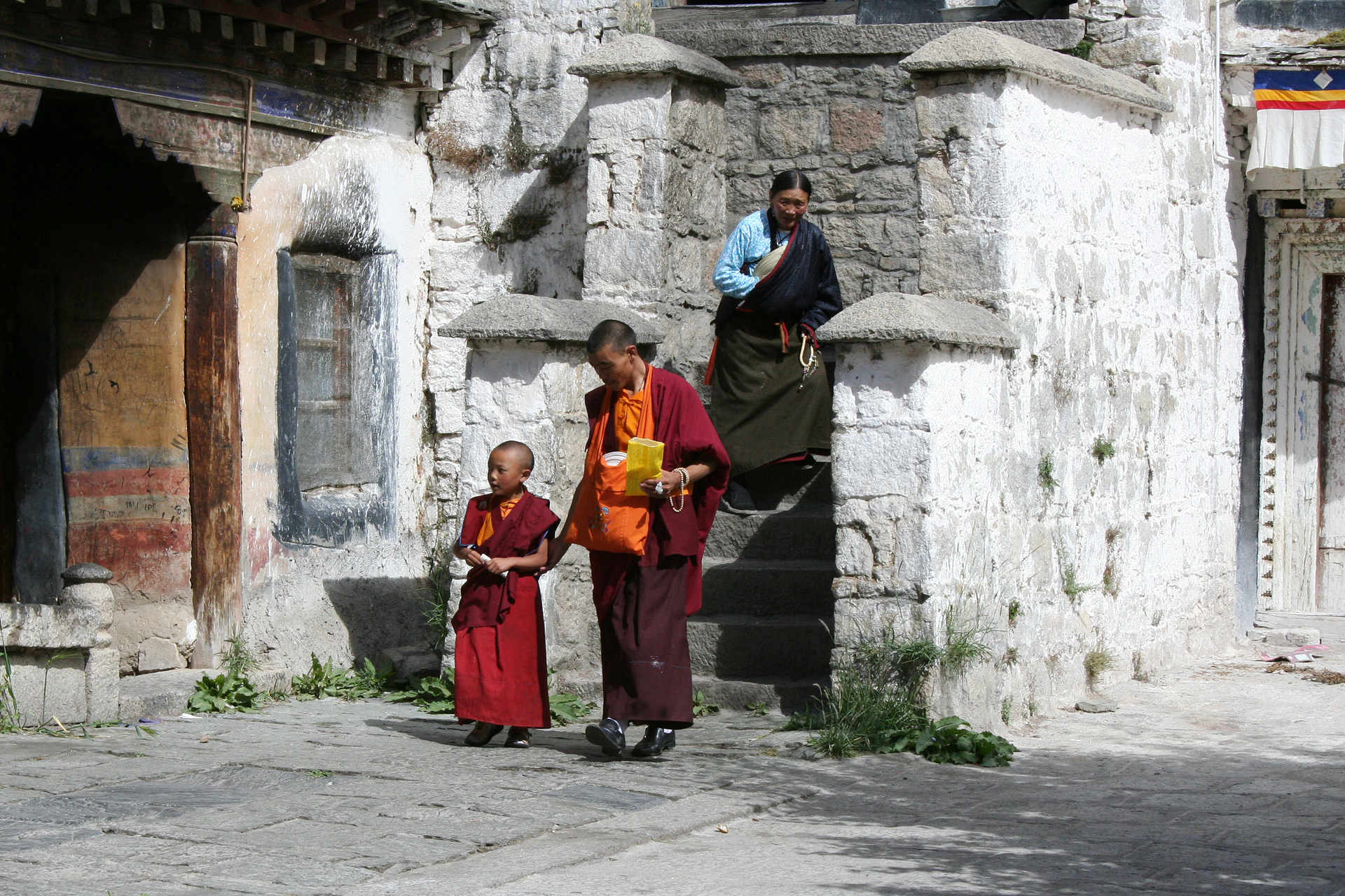 Ein junger Mönch in Begleitung eins älteren und seiner Mutter