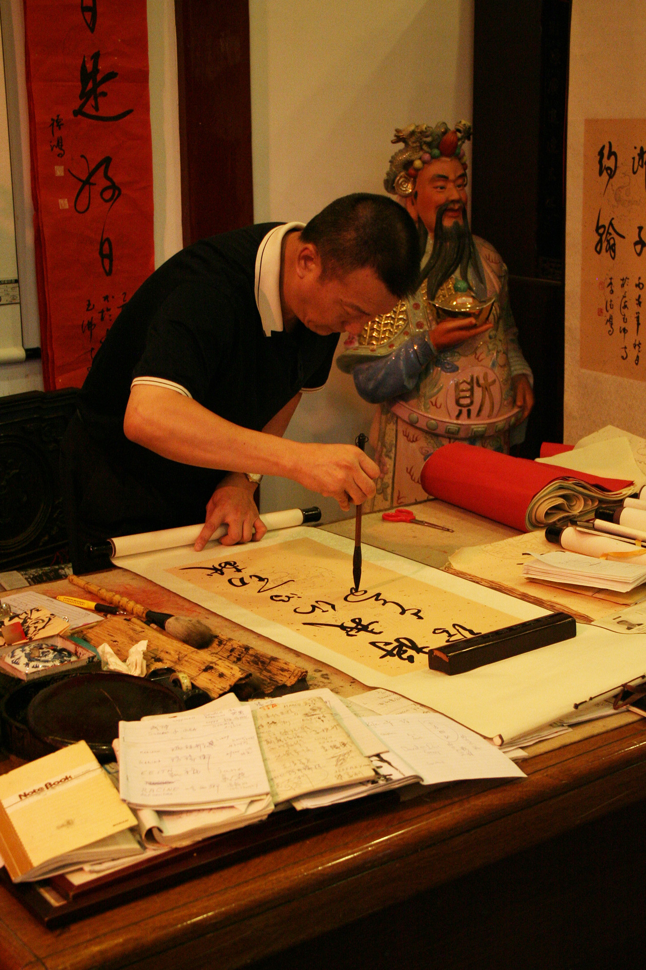 Ein Kalligraph beim Erstellen einer Kalligraphie mit Pinsel und Tusche