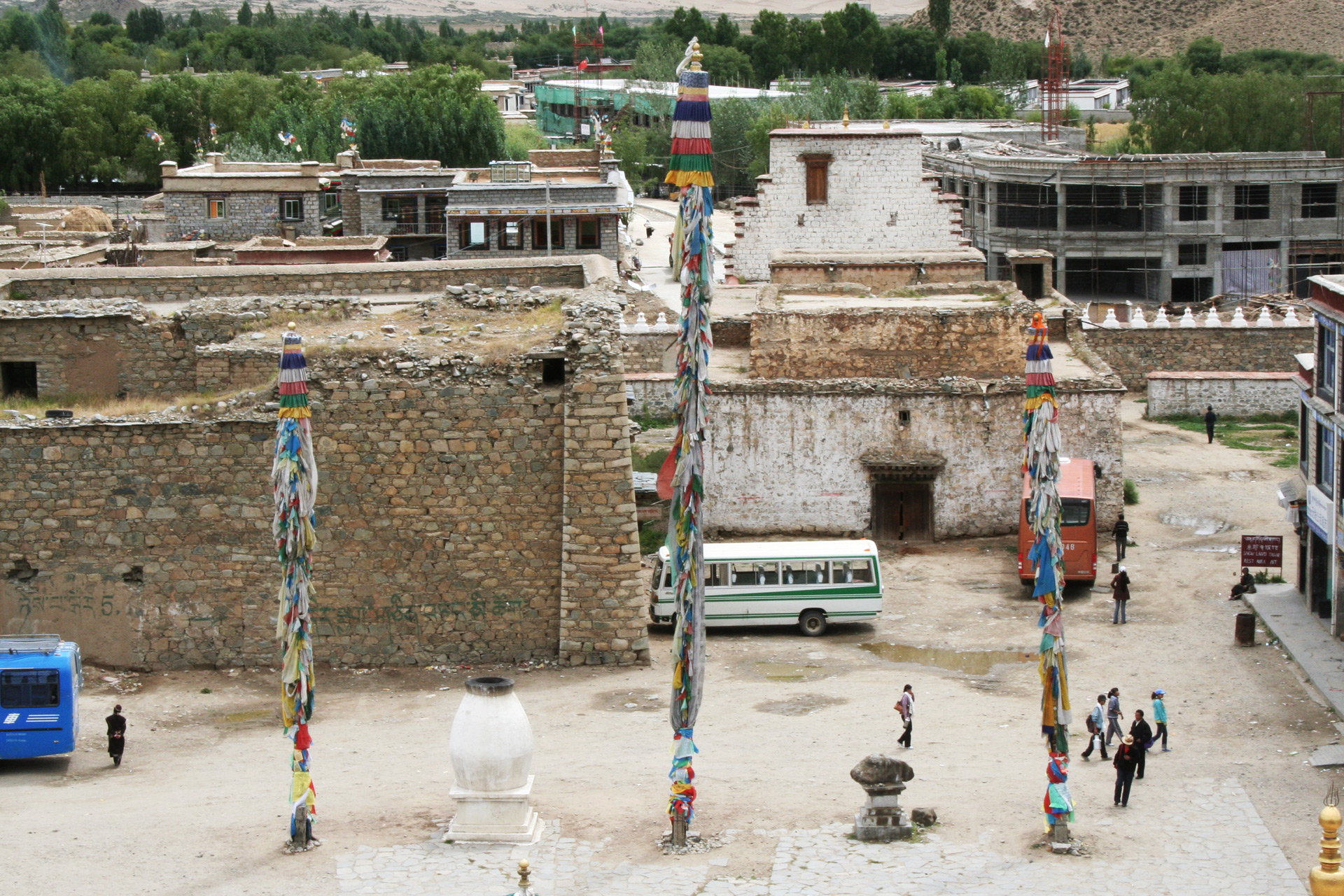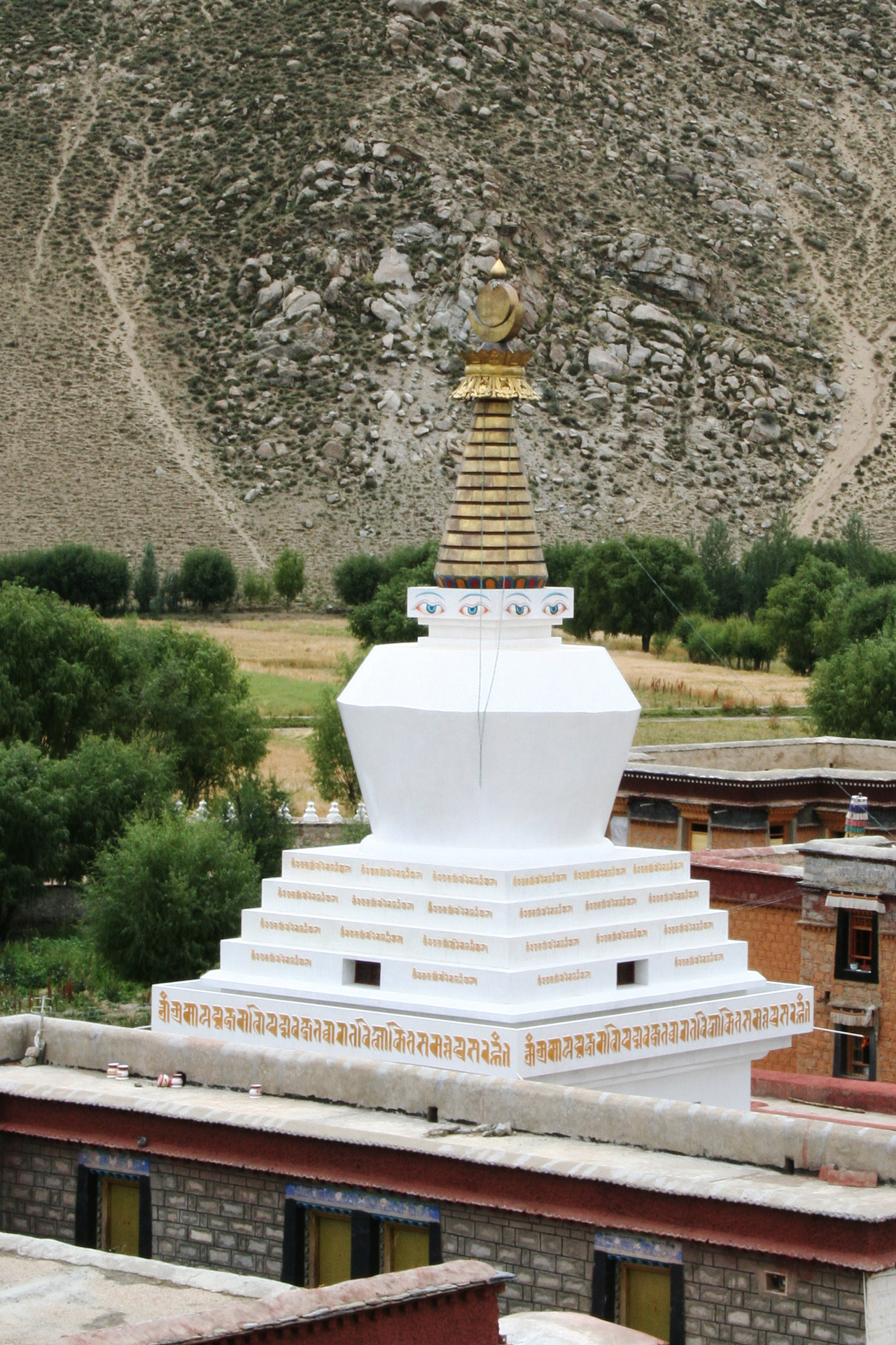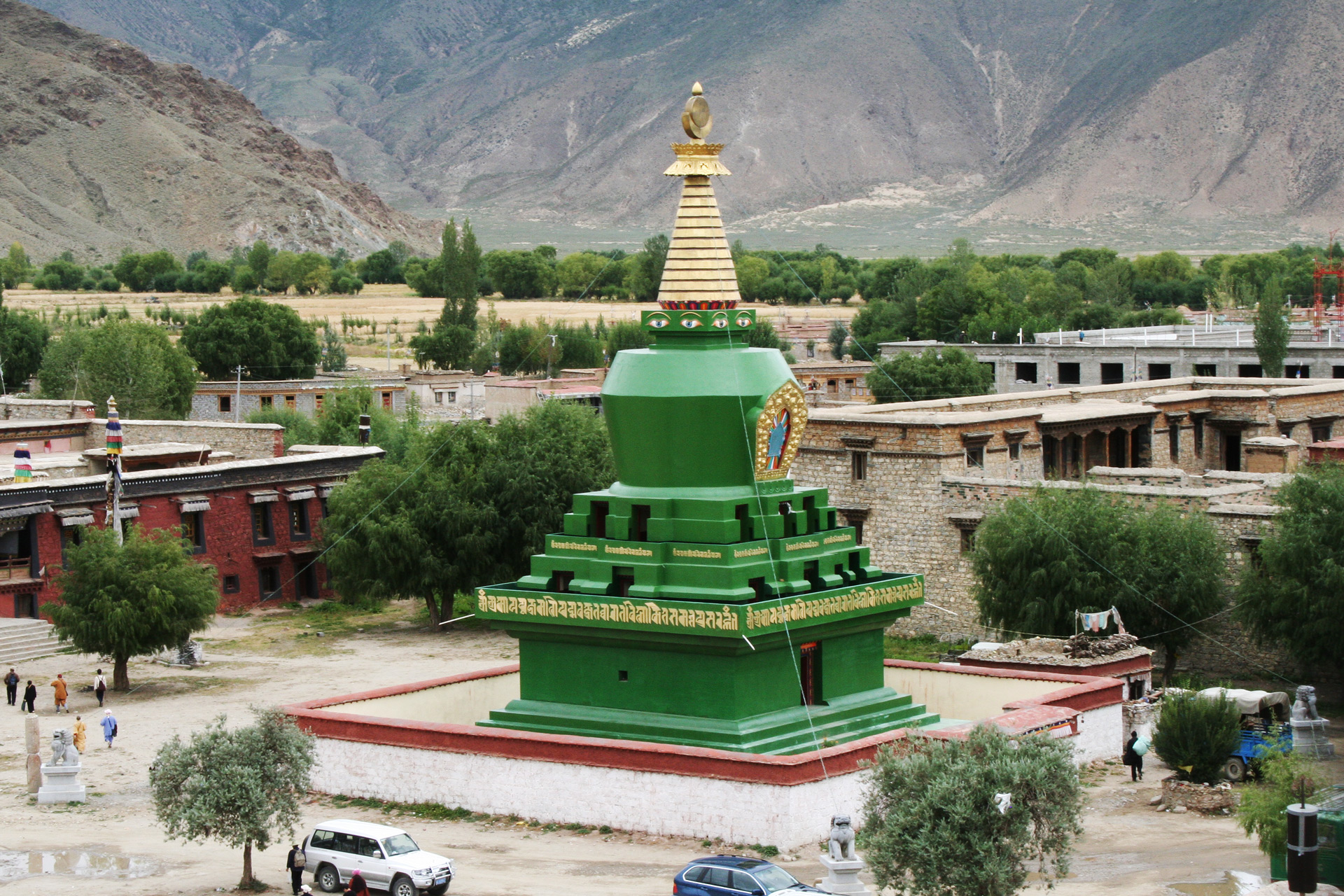 Die Anlage ist wie ein Mandala aufgebaut, sie wird von vier Stupa umgeben, einem grünen Stupa ...