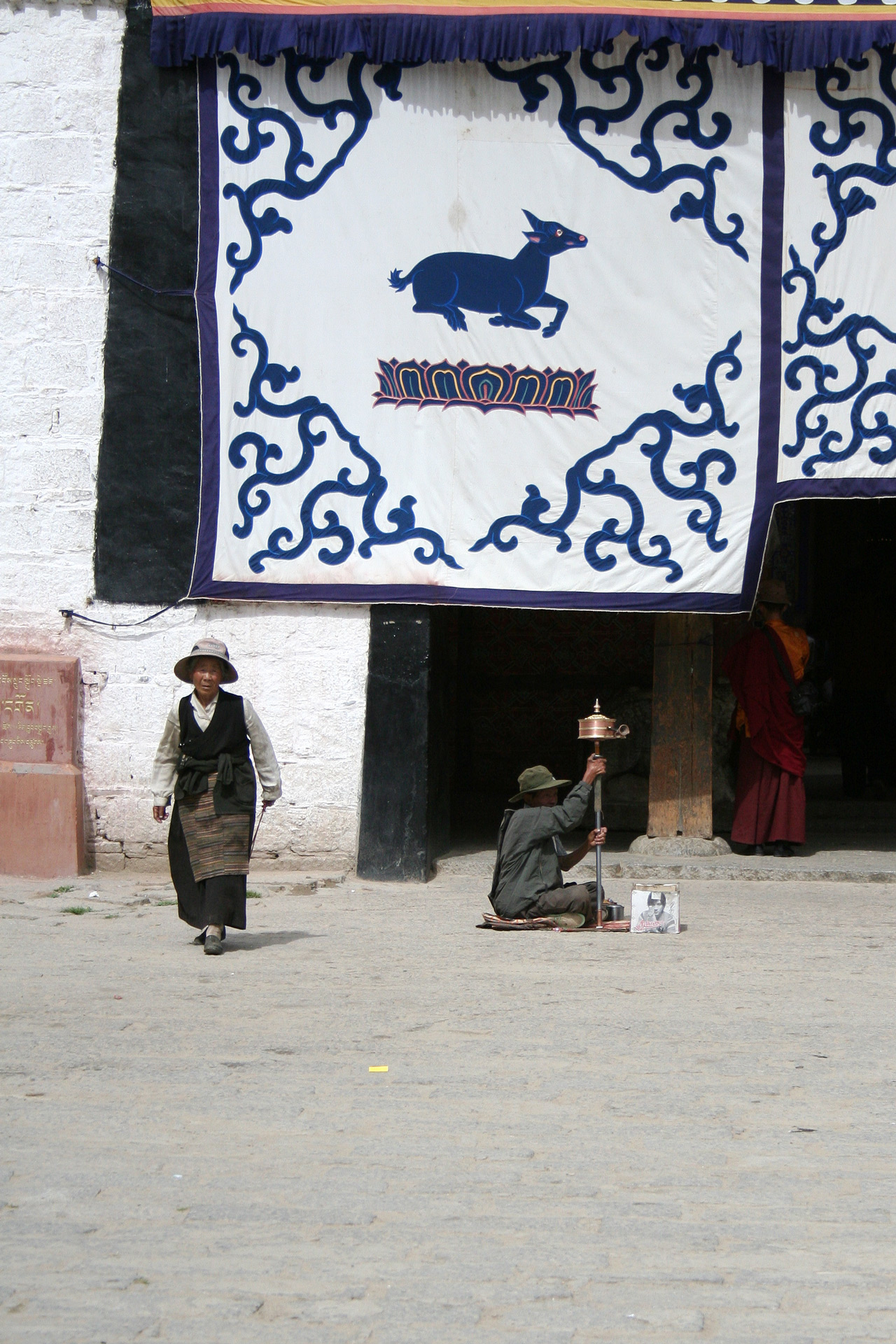 Ein Pilger der vor dem Eingang um Almosen bittet