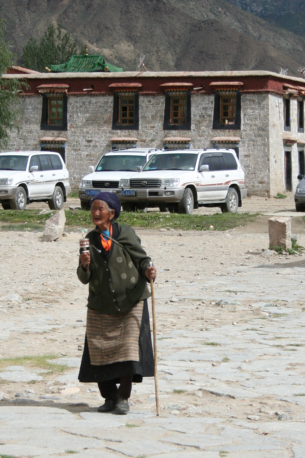 Eine tibetische Pilgerin mit einer Gebetsmühle